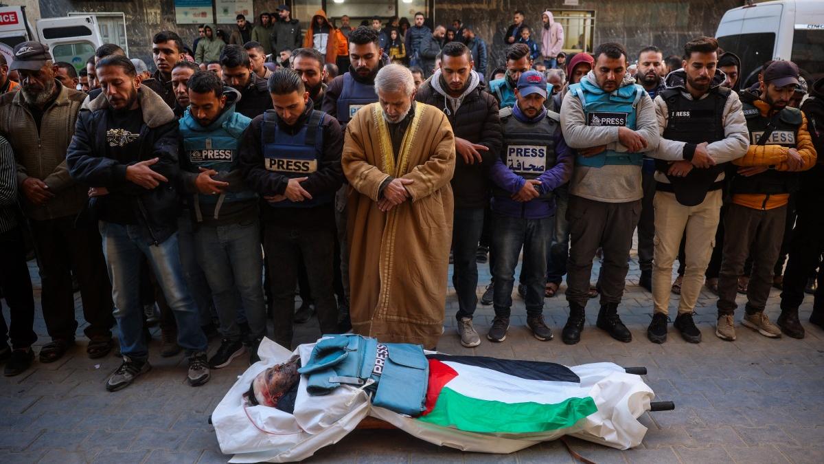 Mourners in Nuseirat on December 16, 2024 pray in front of the body of Al Jazeera journalist Ahmad Baker Al-Louh, who was killed along with Civil Defence members in an Israeli strike the day before.