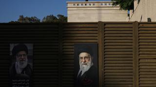 Pictures of Iran’s late Supreme Leader Ayatollah Ali Khamenei are displayed inside the Iranian embassy in Beirut, as people attend a gathering to pay tribute to him and to show support for Iran’s new Supreme Leader, Mojtaba Khamenei, in Beirut, Lebanon, April 22, 2026.